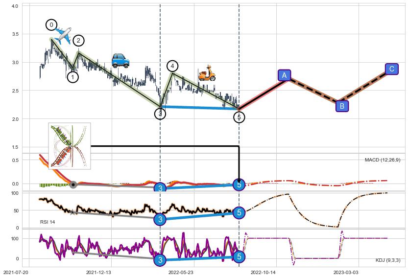 ➣ 1,3,5驱动浪MACD, RSI, KDJ走势都出现【常规背离】反转信号增强
