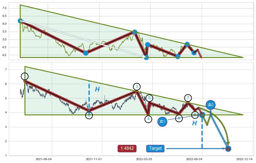 ➢ 最小反转跌幅→𝐇: 2.205 (逐步抬高阻力斜边最后的阻力点⑥与支撑边垂直距离)