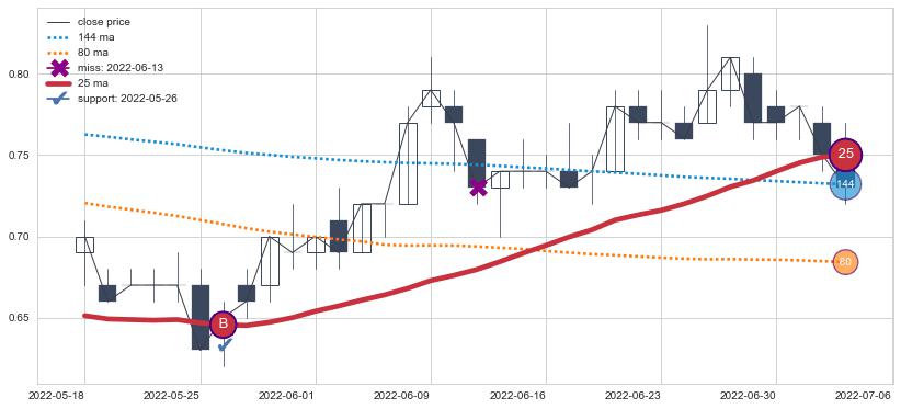 上涨趋势2022-05-18-2022-07-06,均线25确认关键支撑1处