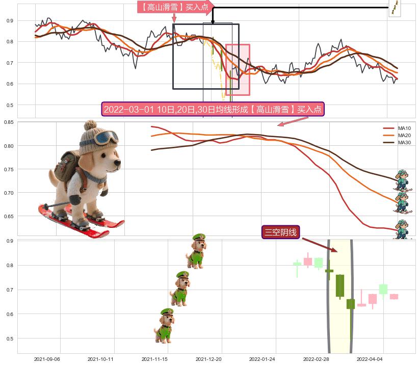 | 4 🅚:三只乌鸦 ➕ 🎢:【战机起航】卖出点均线组合卖出点信号形成后,猜想后续上行结束,持续回落下跌(均值回复) ☞ 看空信号 ⇥ 【均线】交织【🅚线】⇥ 综合量化分数: 45 | > |