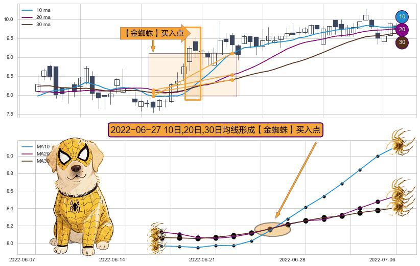 ⚀ 2022-06-27日显现 10日-20日-30日均线 【金蜘蛛】买入点 看多信号,后市看涨,买入