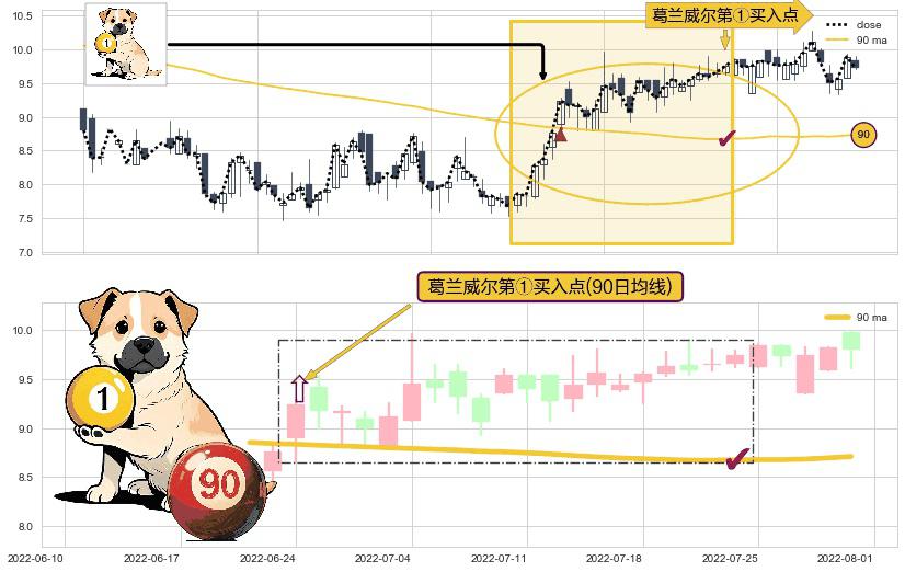 ⚀ 2022-06-24-日显现 葛兰威尔均线 90日均线 第买①入点 走势反转见底信号,后市看涨,买进信号