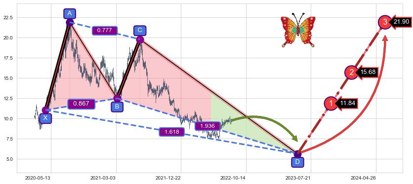 ➣ 未完成【蝴蝶】形态起点X: 2020-04-17, 已到达C点: 2021-06-22, 预测最终D点: 2023-05-25, 共713交易日
