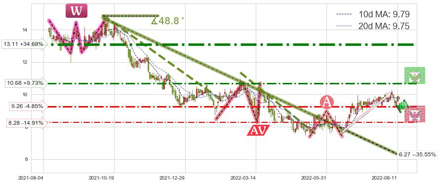 ♘ 阻力价格位10.68,可信任强度66.45%,距离最后交易2022-08-12形成的收盘价格9.73相差 +9.73%