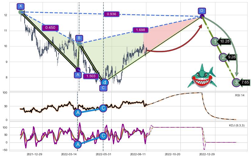 ➣ 未完成【鲨鱼】形态起点X: 2021-11-12, 已到达C点: 2022-05-13, 预测最终D点: 2022-12-02, 共259交易日