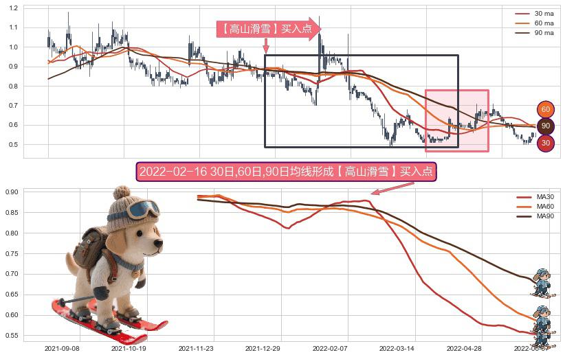⚀ 2021-11-15日-2022-05-30日显现 30日-60日-90日均线 【高山滑雪】买入点 看多信号,后市看涨,买入