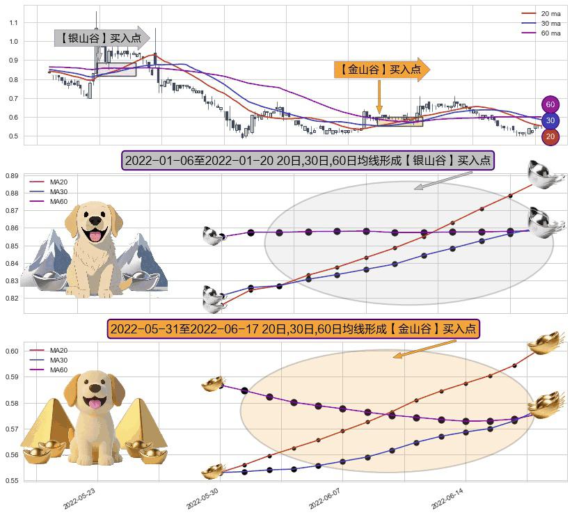 ⚀ 2022-06-01-日至2022-06-17-日显现 20日-30日-60日均线 【金山谷】买入点 其再次确认了买入信号,可靠性更强,买入