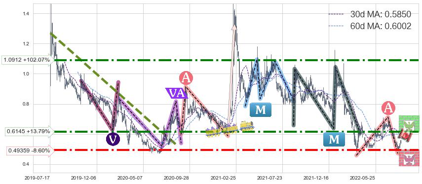 ♘ 支撑价格位0.49359,可信任强度81.58%,距离最后交易2022-08-12形成的收盘价格0.5400相差 -8.60%