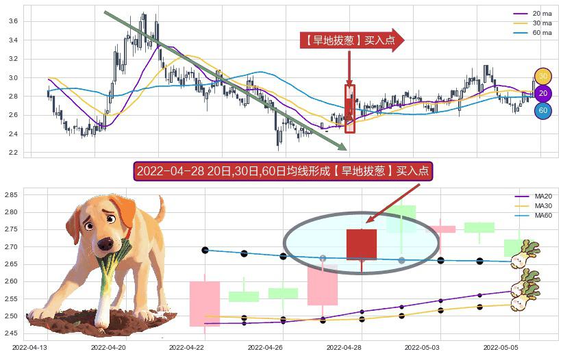 形态多维评估: ⚀ 2022-04-28日显现 20日-30日-60日均线 【旱地拔葱】买入点 看多信号,后市看涨,买入