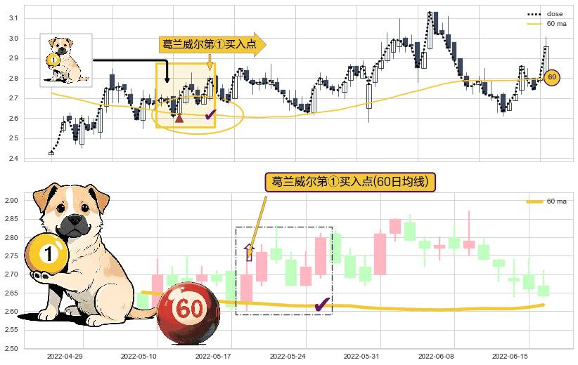 形态多维评估: ⚀ 2022-05-18-日显现 葛兰威尔均线 60日均线 第买①入点 走势反转见底信号,后市看涨,买进信号