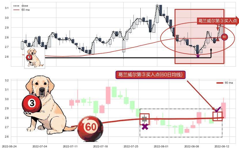 形态多维评估: ⚀ 2022-08-11-日显现 葛兰威尔均线 60日均线 第③买入点 上升趋势的中继信号,后市看涨,买进信号