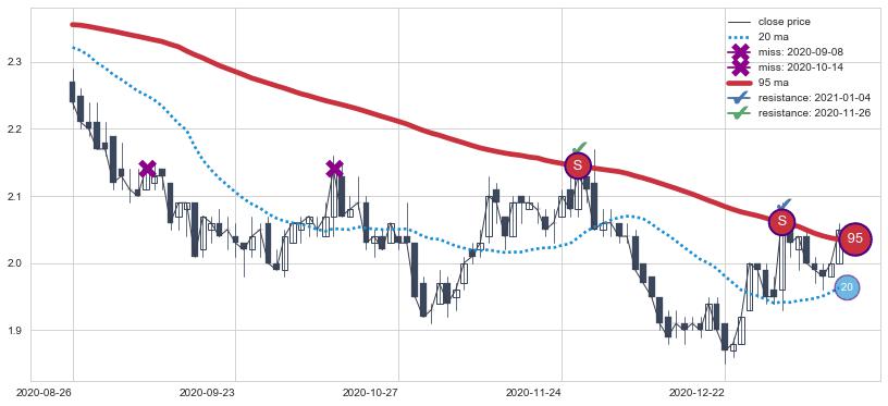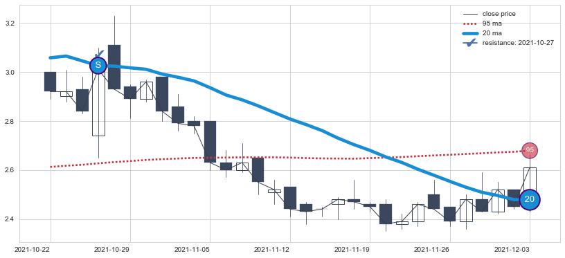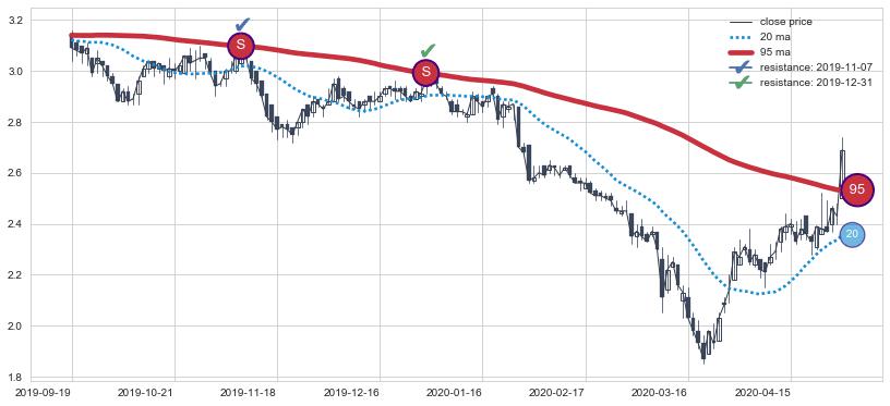 下跌趋势2022-01-06-2022-04-19,均线20, 95确认关键阻力2处