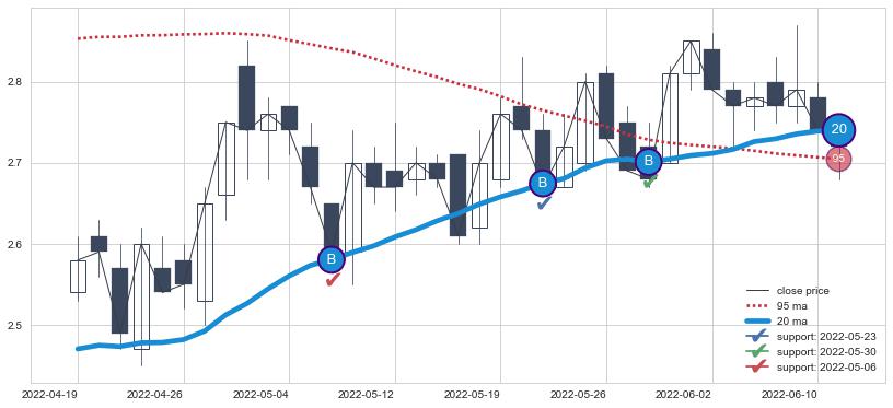 上涨趋势2022-04-19-2022-06-13,均线20确认关键支撑3处