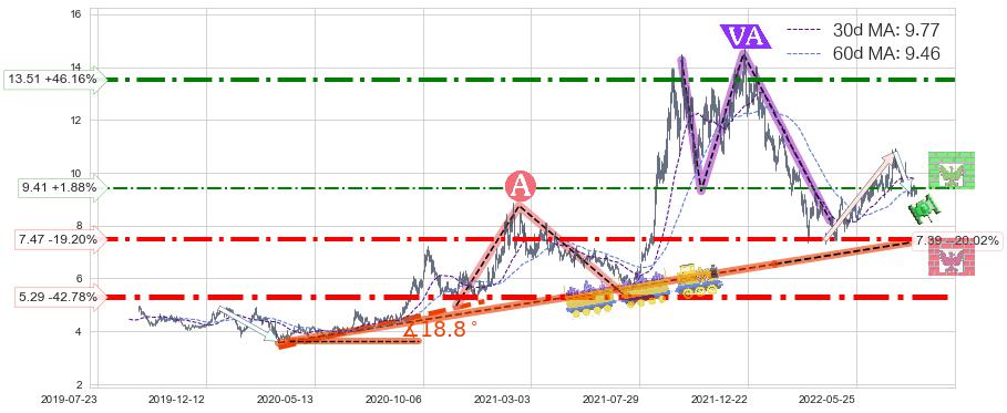 ♘ 阻力价格位9.41,可信任强度43.08%,距离最后交易2022-08-12形成的收盘价格9.24相差 +1.88%
