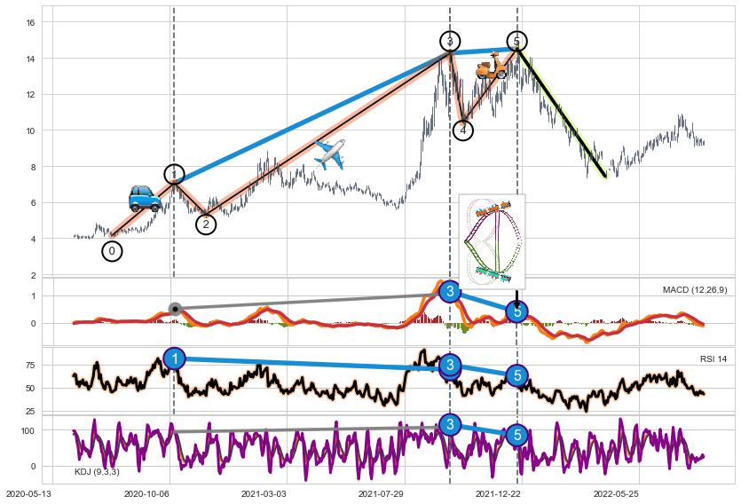 ➣ 1,3,5驱动浪MACD, RSI, KDJ走势都出现【常规背离】反转信号增强