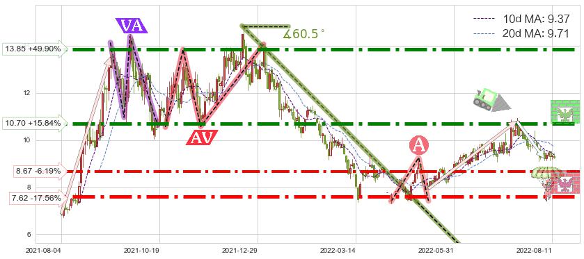 ♘ 阻力价格位10.70,可信任强度89.15%,距离最后交易2022-08-12形成的收盘价格9.24相差 +15.84%