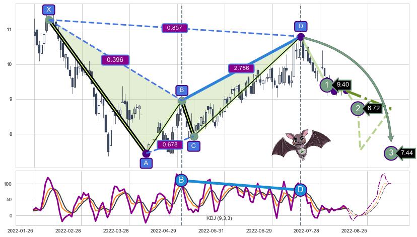 ➣ 已完成【蝙蝠】形态起点X: 2022-02-08, 终点D: 2022-07-18, 共107交易日