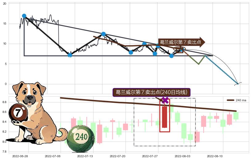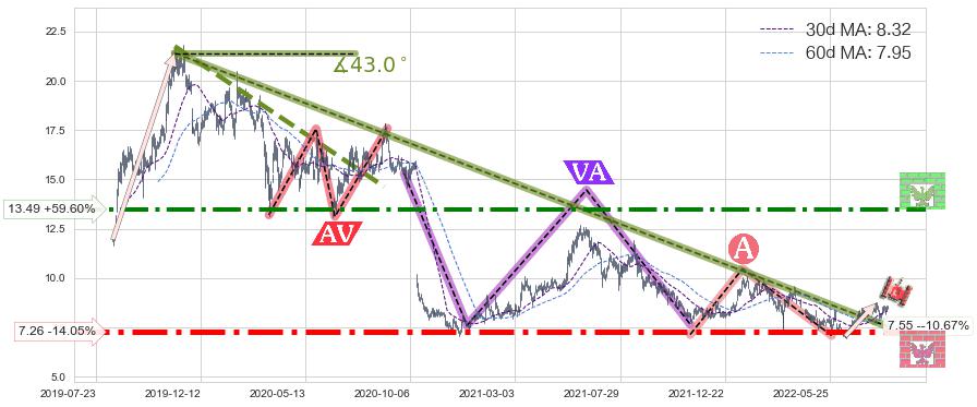 🦴 长线均值回复组合短线趋势跟踪[强阻力信号]2019-11-07-2022-07-27下跌趋势依然成立(下跌趋势跟踪依然存在),短线价格略微上行反弹(均值回复猜想),即将接近下跌趋势提供的未破位阻力价格:7.55。