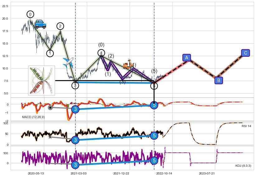 ➢ 1,3,5驱动浪MACD, RSI, KDJ走势都出现【常规背离】反转信号增强
