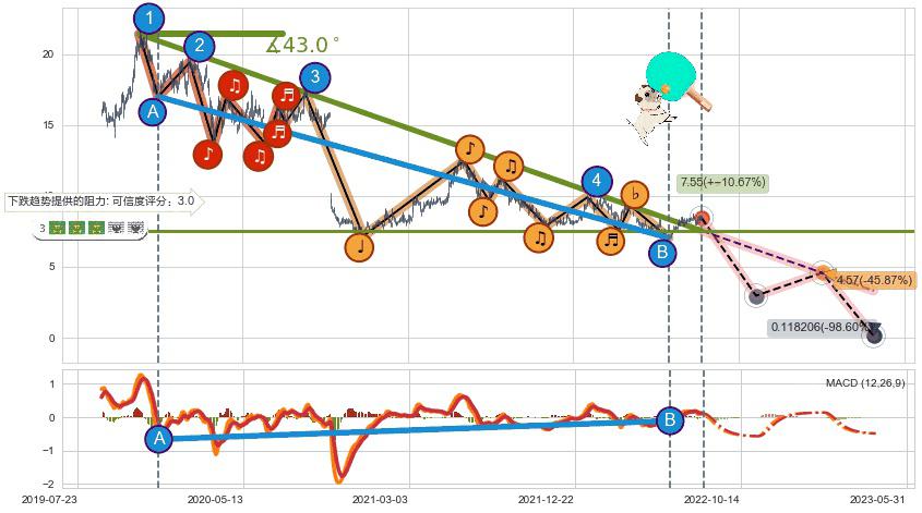 ♘ 在最后的下跌阶段2019-11-07至2022-07-27,存在 破位边缘的阻力位 ,阻力价格7.55,可信任强度75.26%,其距离最后价格8.45相差 -10.67%