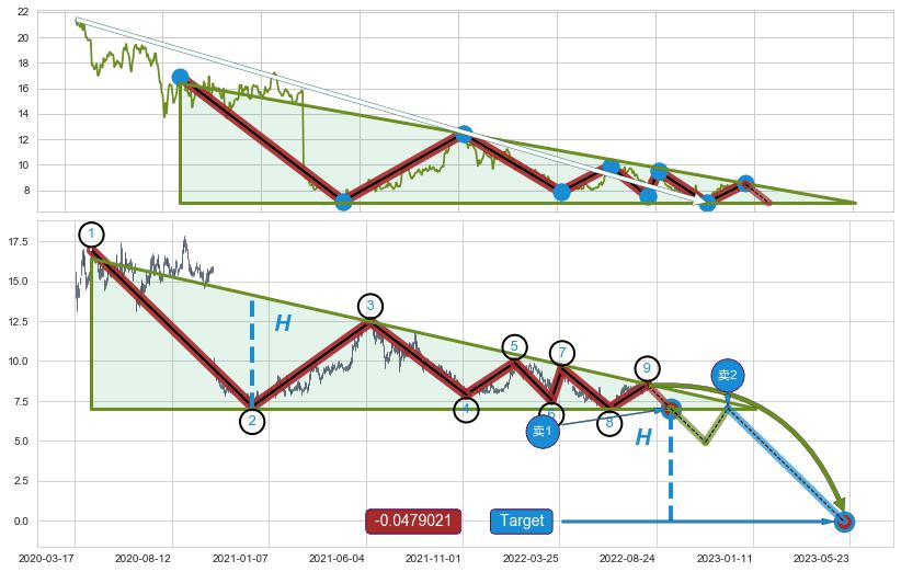 ➣ 【未确认突破,预测即将形成突破】下降三角形整理起点:2020-04-09, 预测突破点:2022-09-14,形态共599交易日