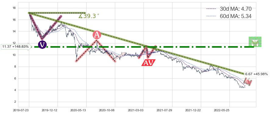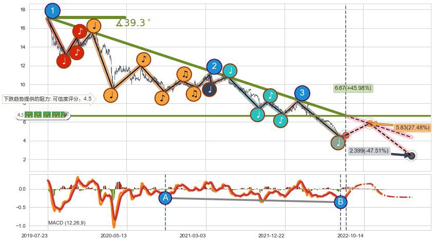 ♘ 在最后的下跌阶段2019-07-23至2022-08-12,存在 持续未破位的阻力位 ,阻力价格6.67,可信任强度88.80%,其距离最后价格4.57相差 +45.98%
