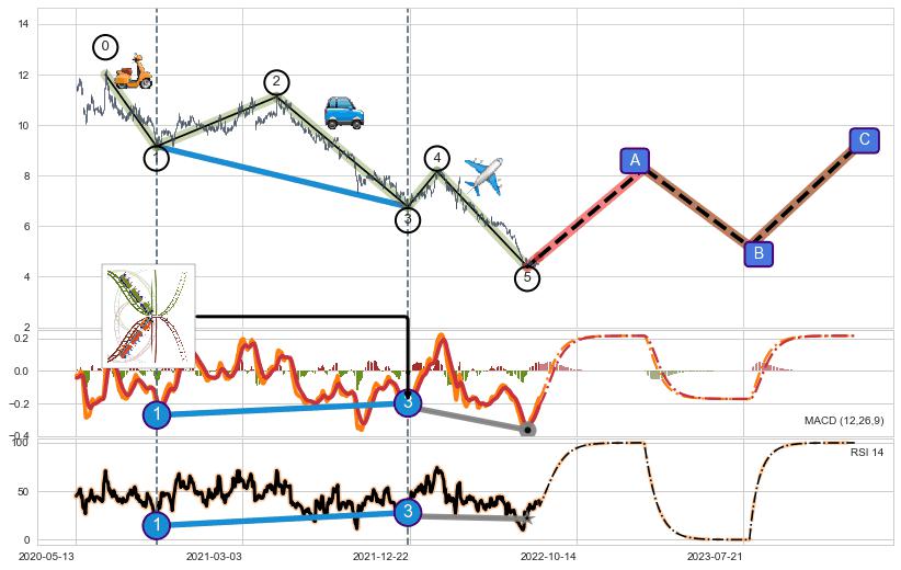 ➣ 第一, 三, 五浪下跌动能逐渐【增强变大】,趋势不断加固