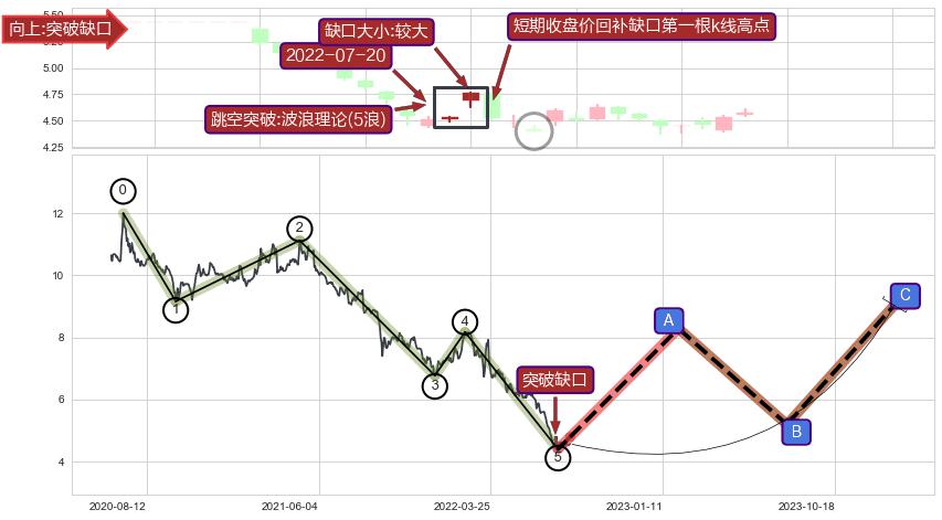 ➣ 突破缺口形成后,后续k已经超过14根,跳空突破波浪理论(5浪)关键点后, 出现【完全回踩】迹象,短期收盘价回补缺口第一根k线高点