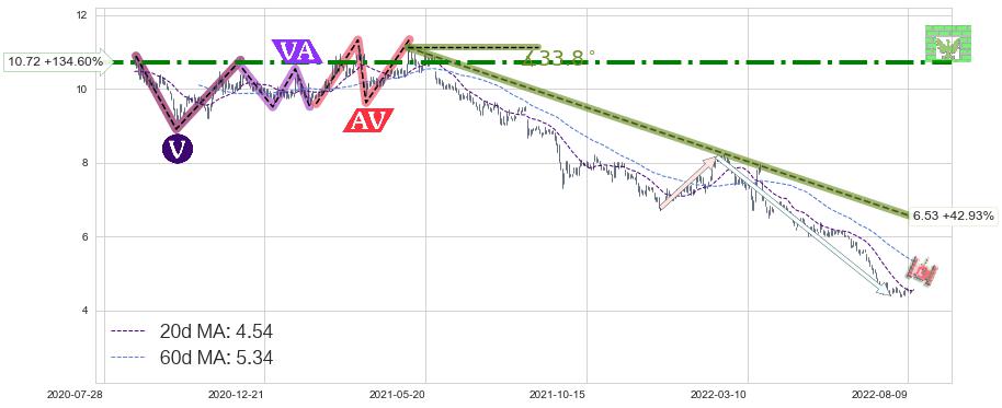 从2021-05-04至2022-08-11,共包含314个交易日,阶段股价下跌-84.22%,阶段股价变动位移路程比: 1 : 4,下跌趋势角度: 33.8