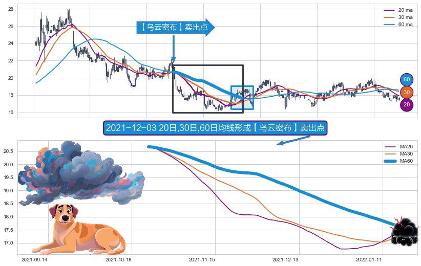 形态多维评估: ⚀ 2021-10-22日-2022-01-17日显现 20日-30日-60日均线 【乌云密布】卖出点 看空信号,后市看跌,卖出