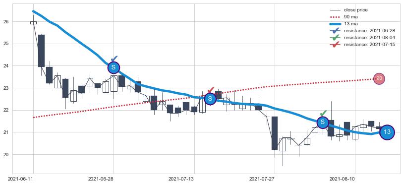 下跌趋势2021-06-11-2021-08-13,均线13确认关键阻力3处