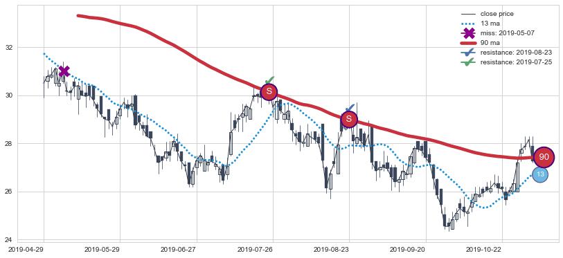 下跌趋势2019-04-29-2019-11-01,均线90确认关键阻力2处