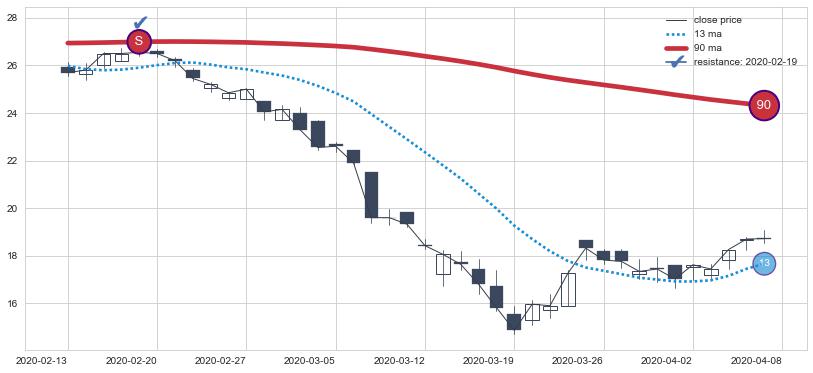 下跌趋势2020-02-13-2020-04-08,均线90确认关键阻力1处