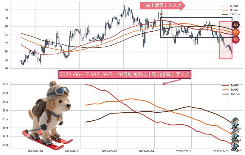 ⚀ 2022-04-19日-2022-08-12日显现 60日-90日-120日均线 【高山滑雪】买入点 看多信号,后市看涨,买入