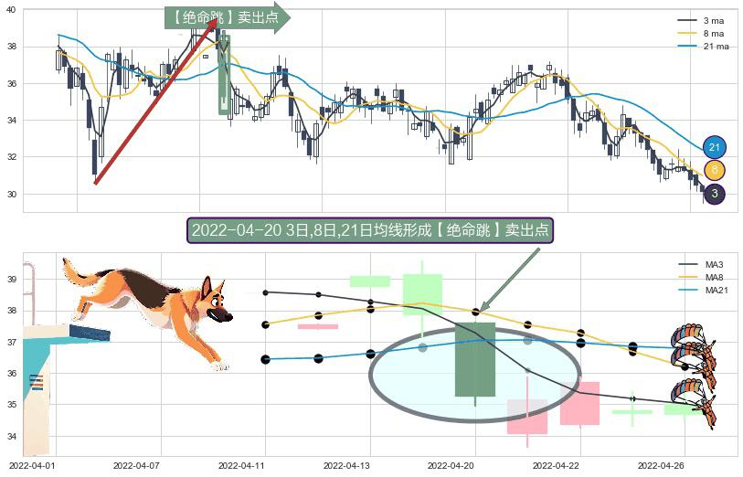 ⚀ 2022-04-20日显现 3日-8日-21日均线 【绝命跳】卖出点 看空信号,后市看跌,卖出