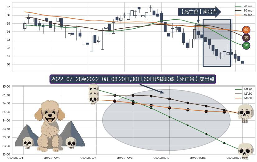 ⚀ 2022-07-29-日至2022-08-08-日显现 20日-30日-60日均线 【死亡谷】卖出点 看空信号,后市看跌,卖出