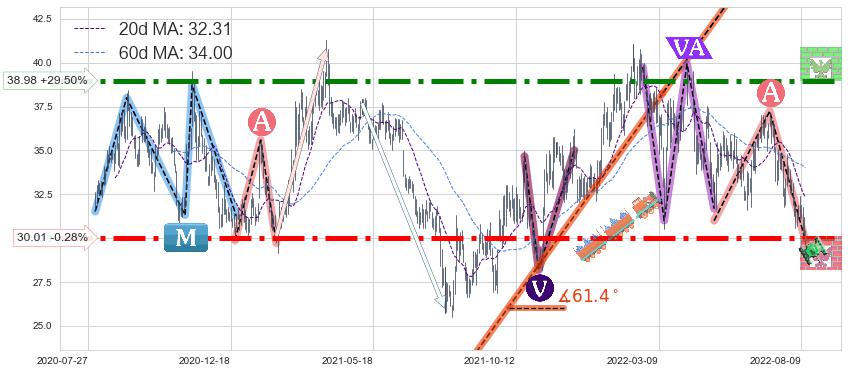 ♘ 阻力价格位38.98,可信任强度96.59%,距离最后交易2022-08-12形成的收盘价格30.10相差 +29.50%