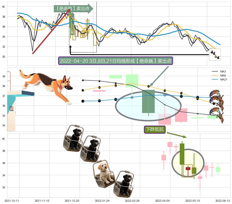 | 2 🅚:下跌两颗星 | 下跌三颗星 ➕ 🎢:【绝命跳】卖出点均线组合卖出点信号形成后,猜想后续向下脱离整理形态,持续破位下行 ☞ 看空信号 ⇥ 【均线】交织【🅚线】⇥ 综合量化分数: 49 | > |