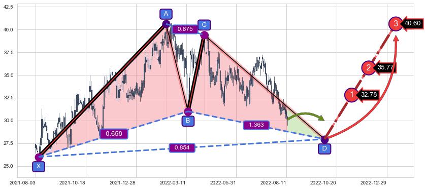 ➣ D点拟合预测价格27.95,距离最后交易收盘价格30.10相差 -7.13%