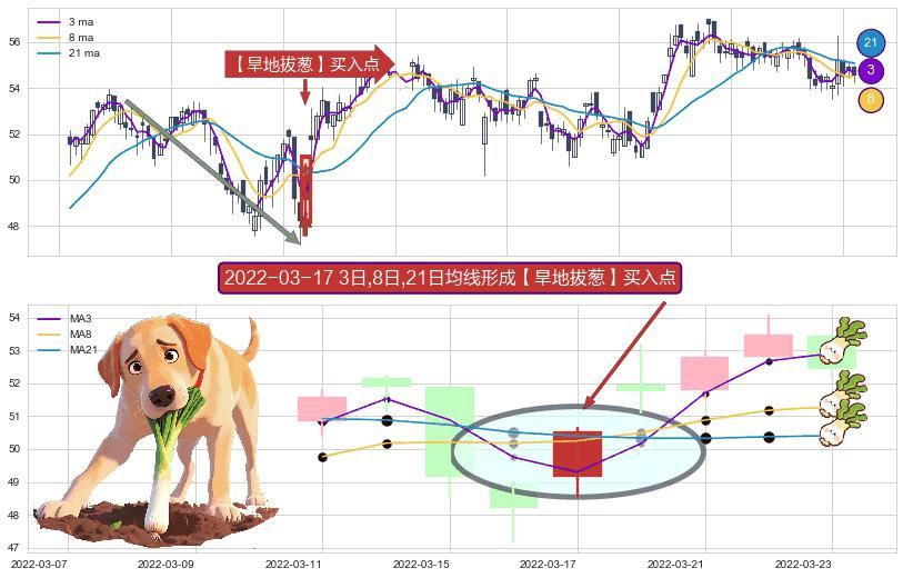 ⚀ 2022-03-17日显现 3日-8日-21日均线 【旱地拔葱】买入点 看多信号,后市看涨,买入