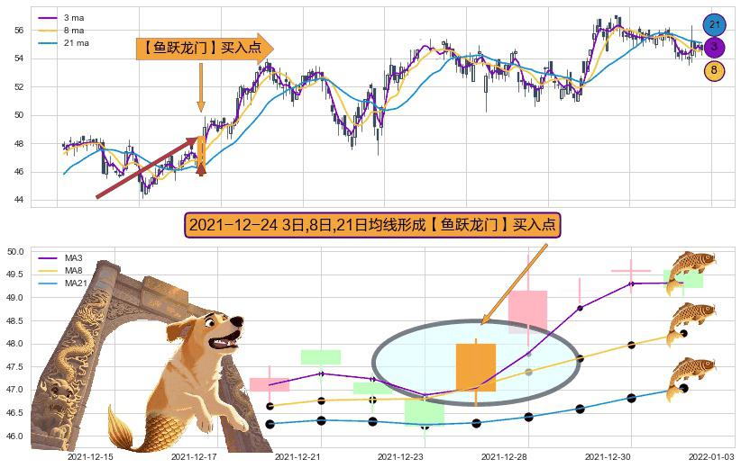 ⚀ 2021-12-24日显现 3日-8日-21日均线 【鱼跃龙门】买入点 看多信号,后市看涨,买入