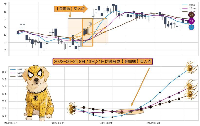 ⚀ 2022-06-24日显现 8日-13日-21日均线 【金蜘蛛】买入点 看多信号,后市看涨,买入