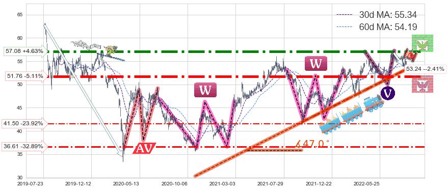 ♘ 阻力价格位57.08,可信任强度91.98%,距离最后交易2022-08-12形成的收盘价格54.55相差 +4.63%