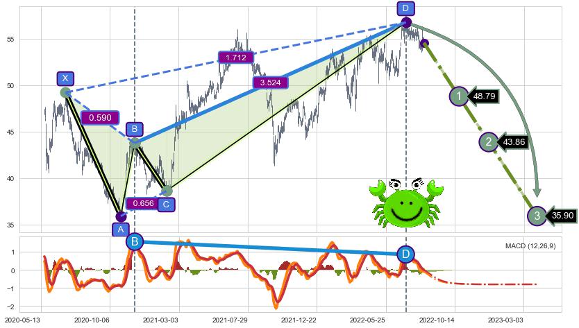 | 15 🅚:【断头铡刀】卖出点 ➕ 📡:谐波螃蟹已到达d点:猜想c拉升到达d点后泄力性下沉下跌(均值回复) ☞ 看空信号 ⇥ 【均线】交织【图形】⇥ 综合量化分数: 48 | > |