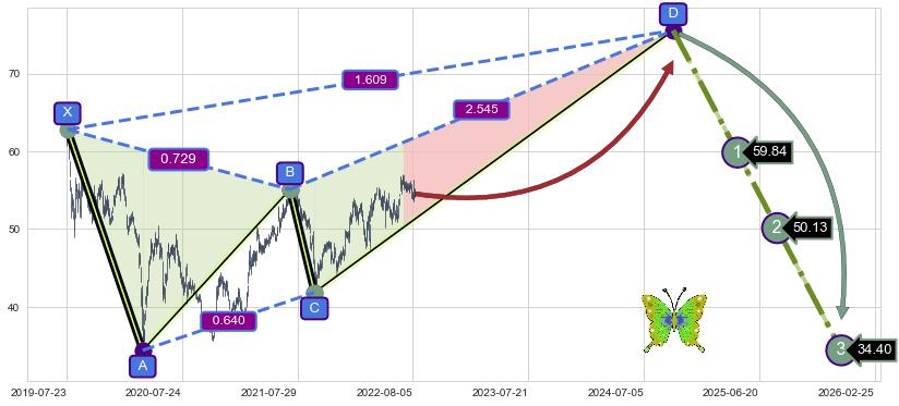 ➣ 未完成【蝴蝶】形态起点X: 2019-07-25, 已到达C点: 2021-09-20, 预测最终D点: 2024-10-03, 共1287交易日