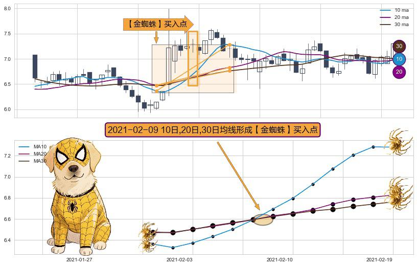 ⚀ 2021-02-09日显现 10日-20日-30日均线 【金蜘蛛】买入点 看多信号,后市看涨,买入