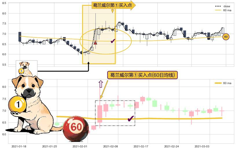 ⚀ 2021-02-03-日显现 葛兰威尔均线 60日均线 第买①入点 走势反转见底信号,后市看涨,买进信号