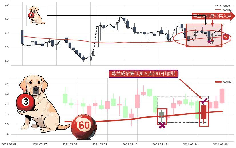 ⚀ 2021-03-25-日显现 葛兰威尔均线 60日均线 第③买入点 上升趋势的中继信号,后市看涨,买进信号