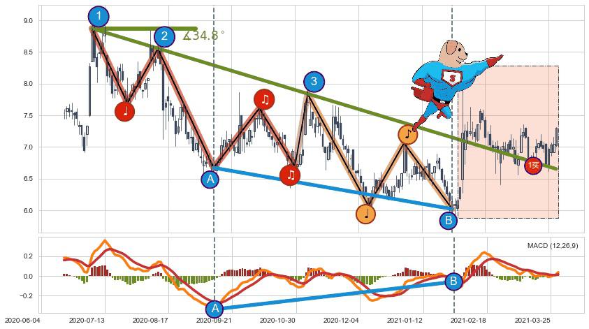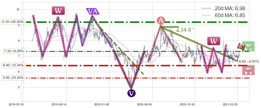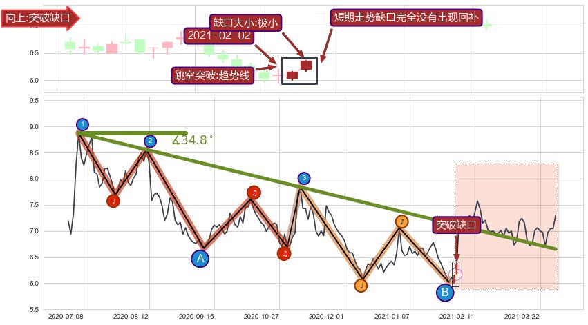 ➣ 2020-07-06-2021-02-11下跌趋势存在反转上涨[机会],其原下跌趋势的阻力位(6.65)已被突破[强支撑信号],原下跌趋势角度: 34.8˚