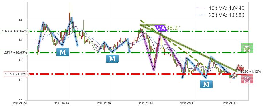 ♘ 阻力价格位1.4834,可信任强度82.55%,距离最后交易2022-08-12形成的收盘价格1.0700相差 +38.64%